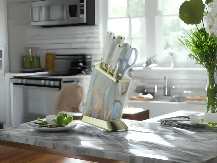 طقم سكاكين ماربل فاخر من هومي تاون©، يحتوي على ٥ سكاكين متعددة الاستخدامات + مقص مطبخ، مع استاند أنيق بخامة ماربل.