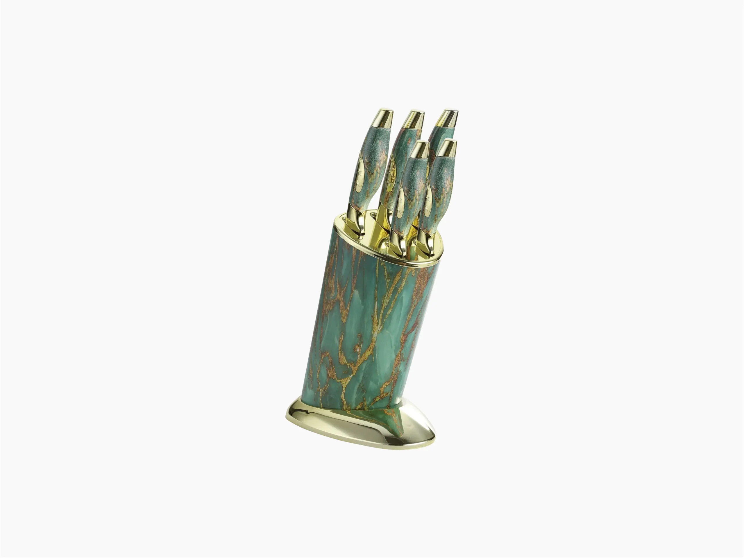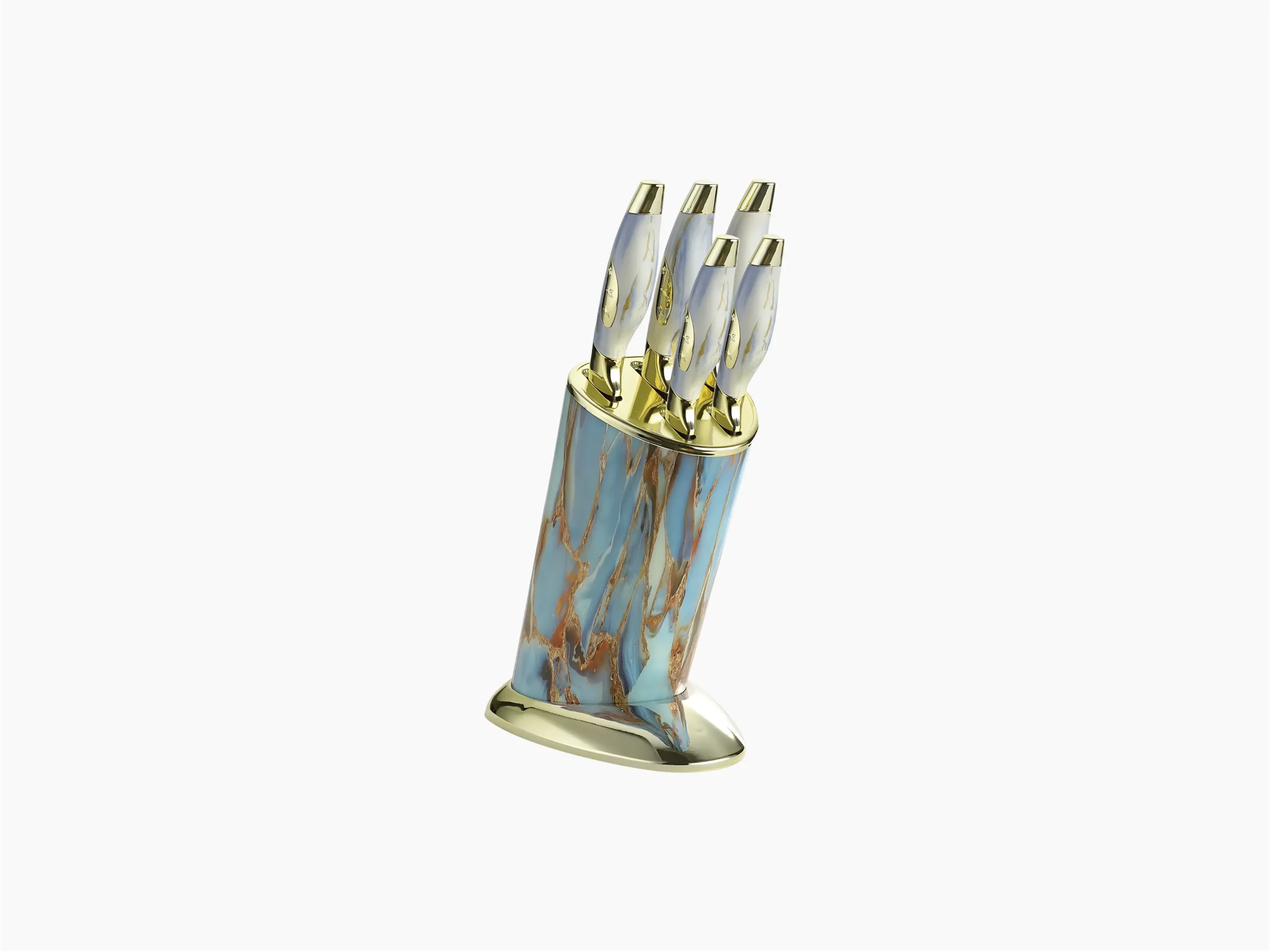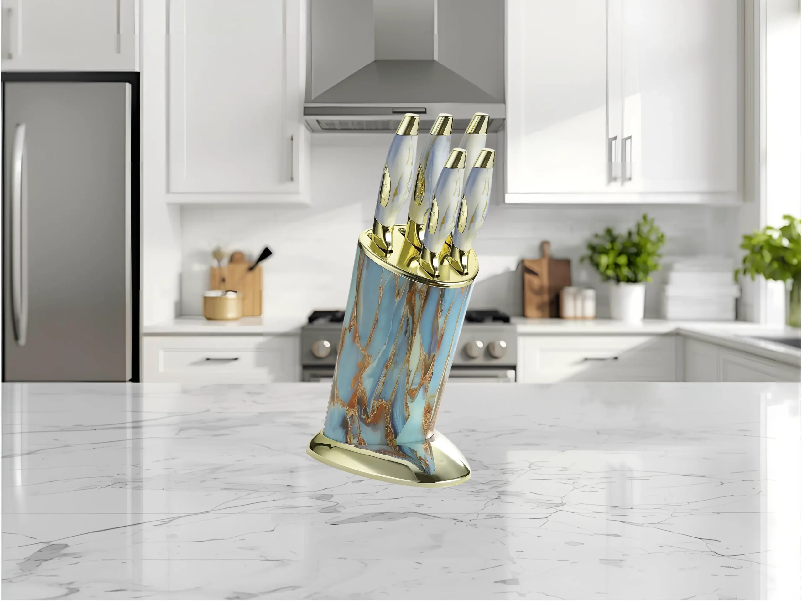 طقم سكاكين نجمة ذهبي نيو ماربل ٥ قطع مع استاند أنيق بخامة ماربل عصرية.