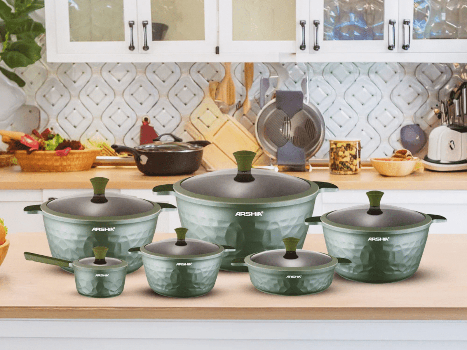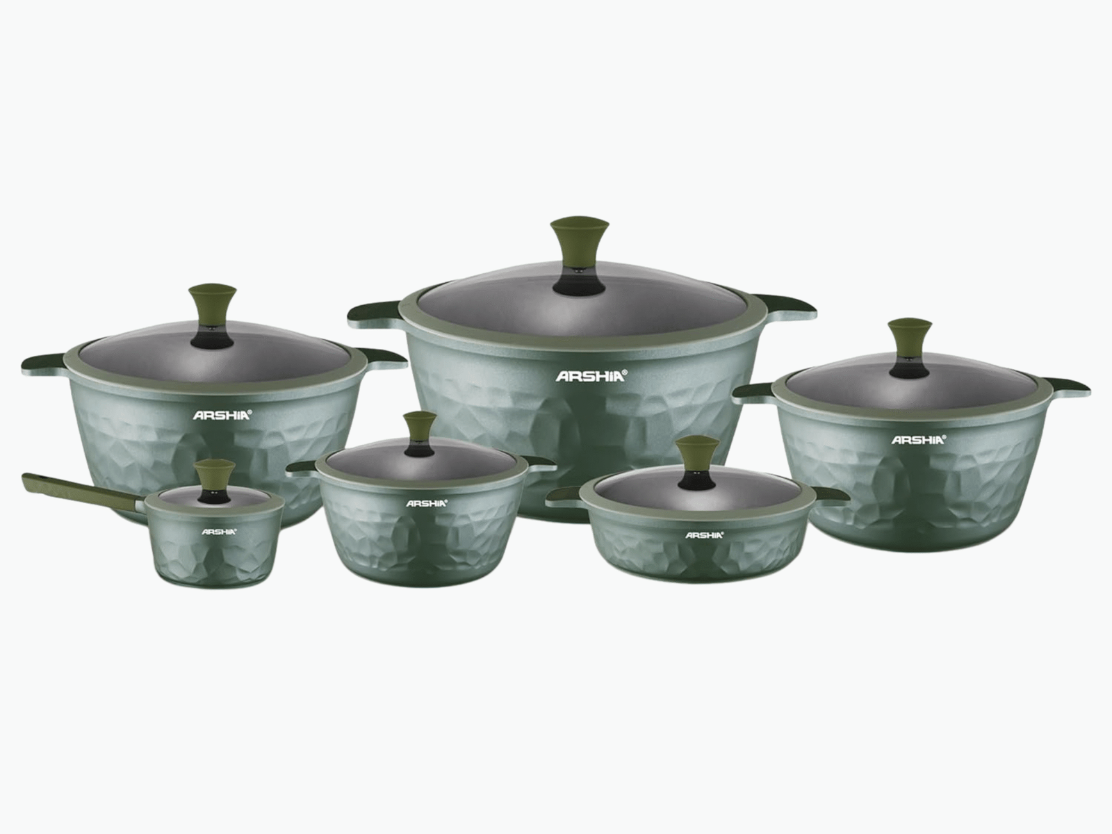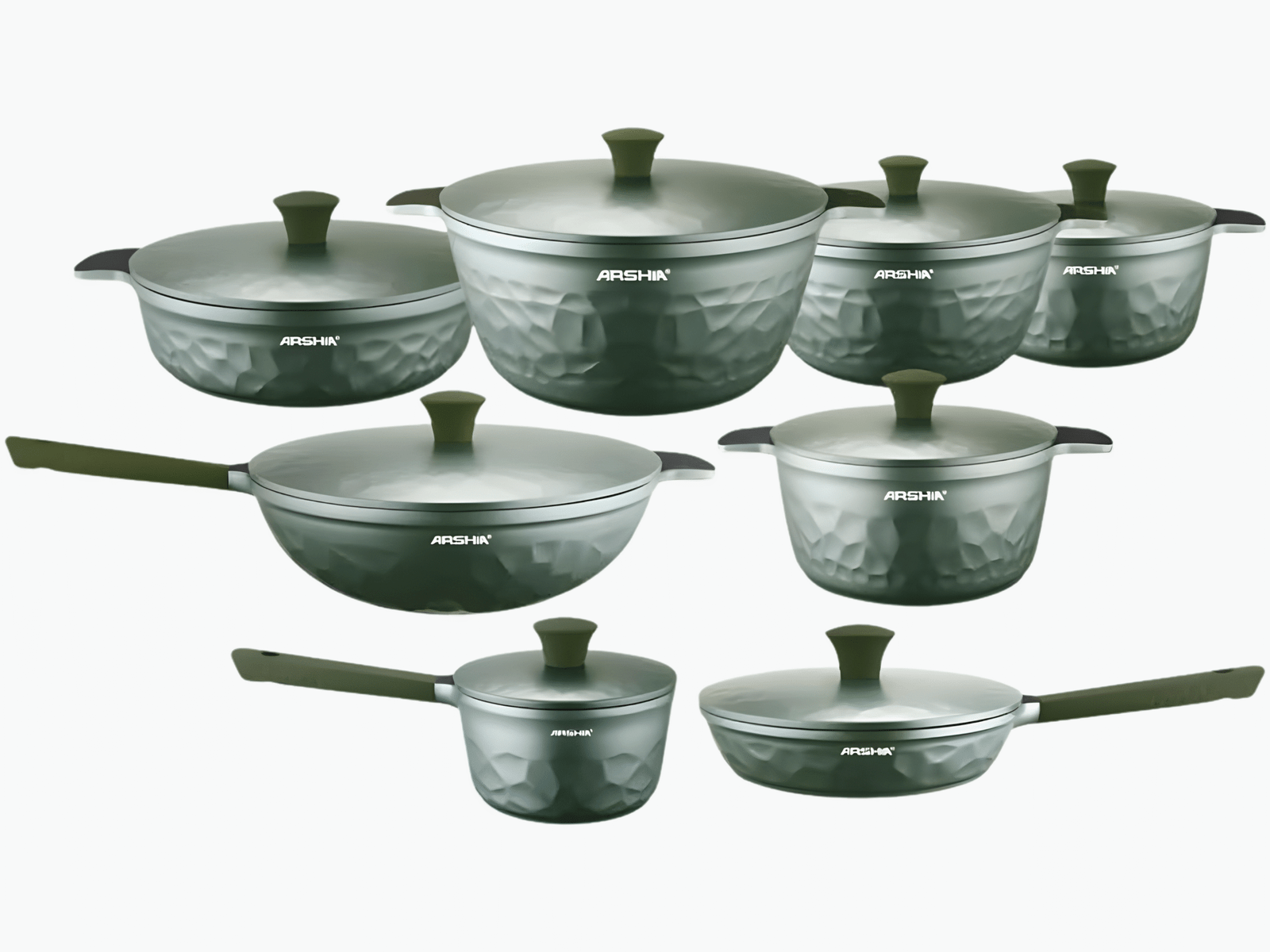 Premium 16-piece Arshia® Green Diamond cookware set made from die-cast aluminium with Teflon Select non-stick interior. Elegant design, great heat distribution, and ideal for everyday cooking.