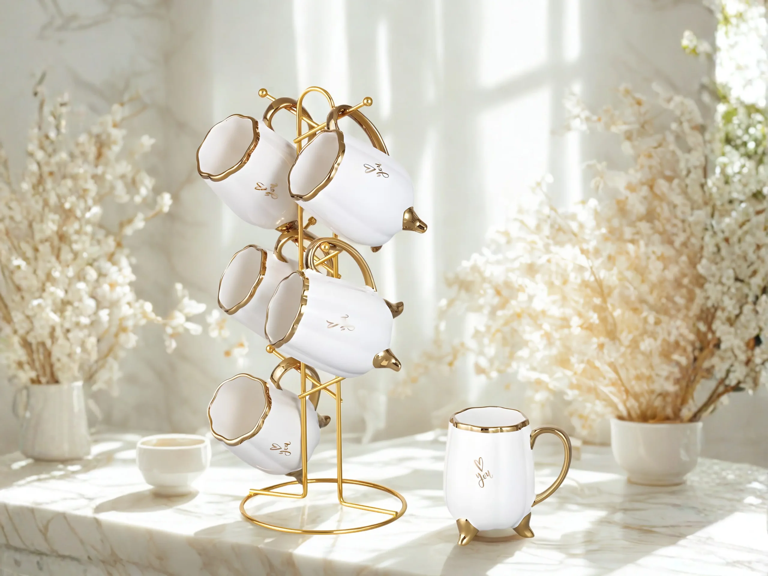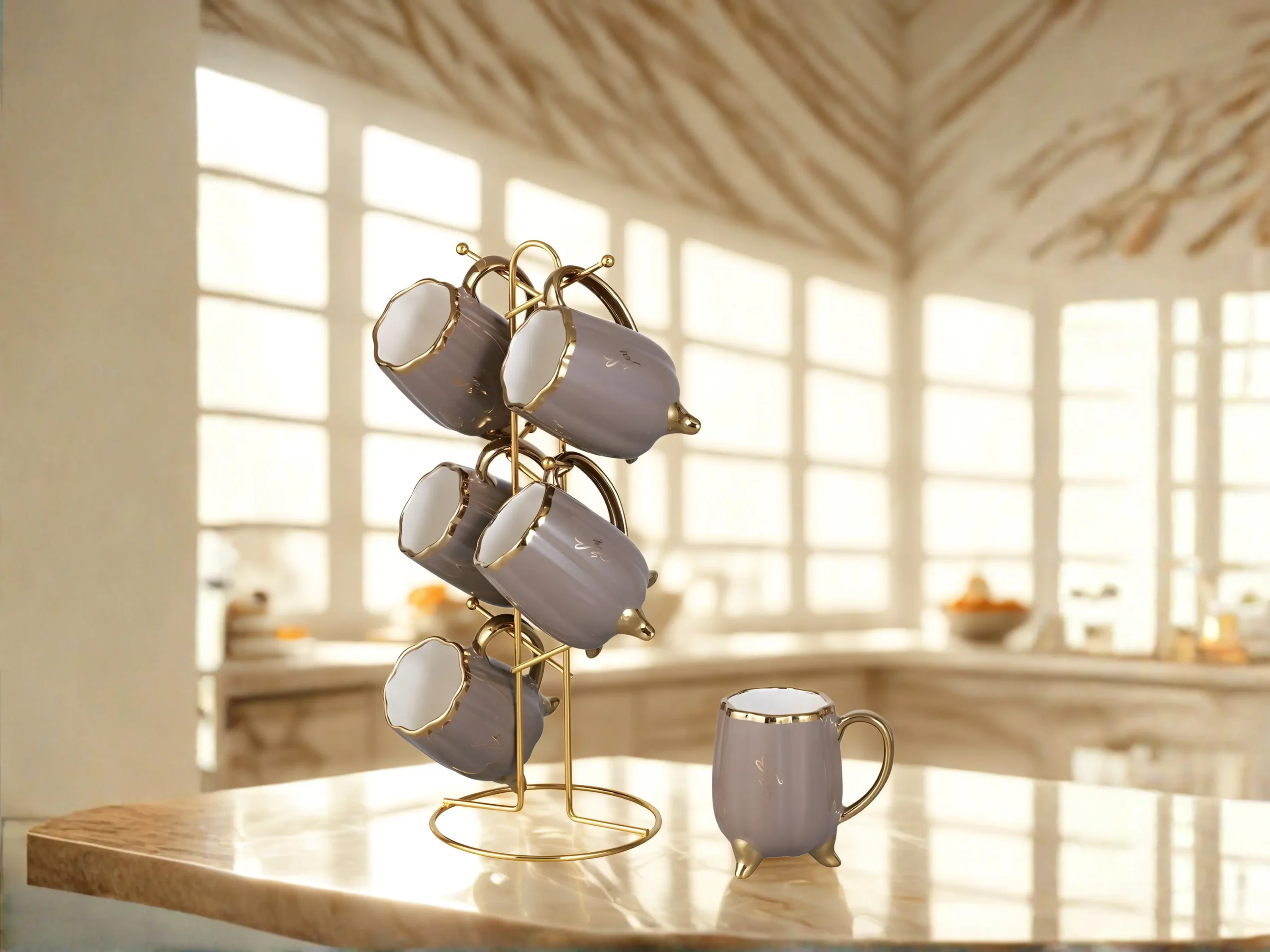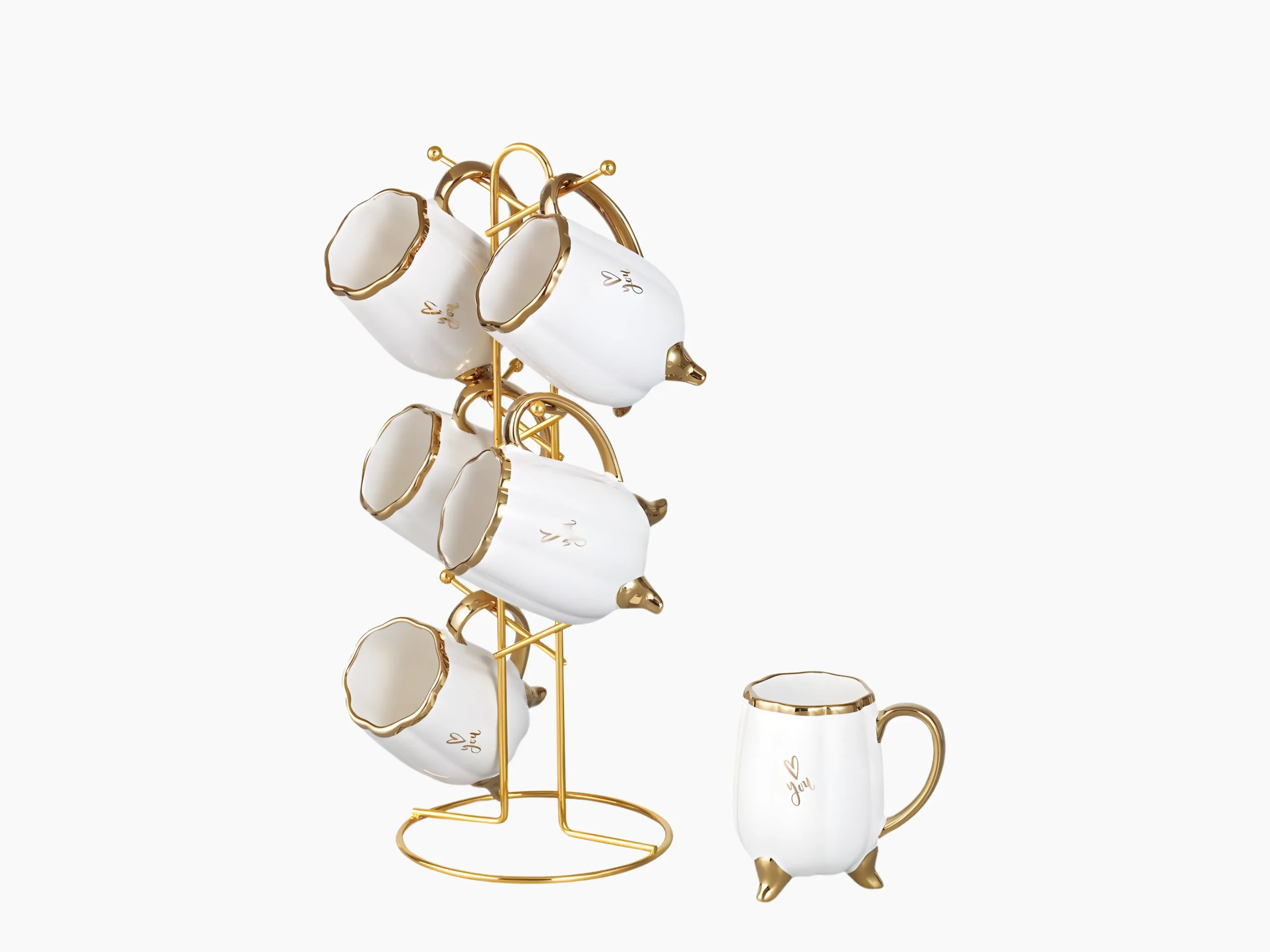 The set includes six mugs with gold-plated legs for added stability and elegance, along with a sturdy gold metal stand that makes it easy to organize the mugs and creates a stylish, organized look.