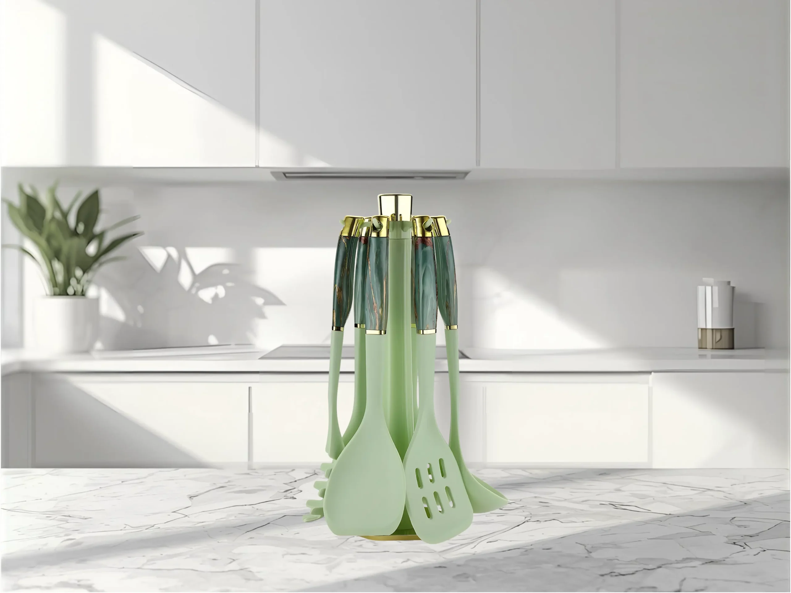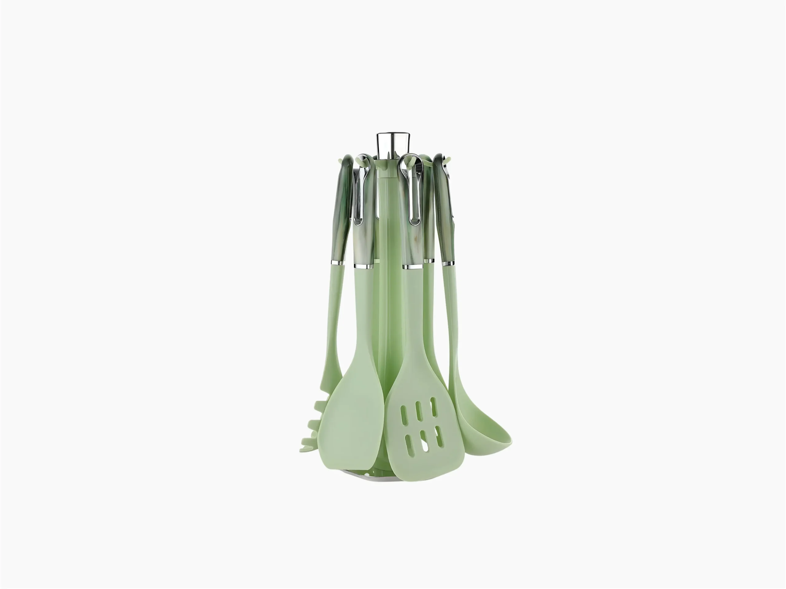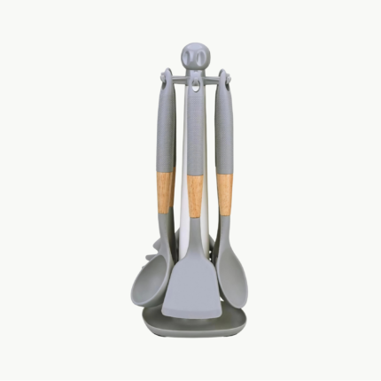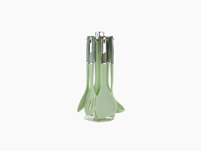 It comes with a practical rotating stand to keep your utensils organized and within easy reach. The non-stick silicone is safe for all cookware and easy to clean.