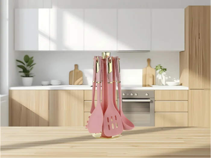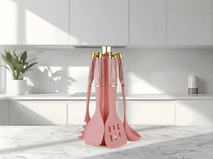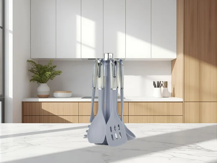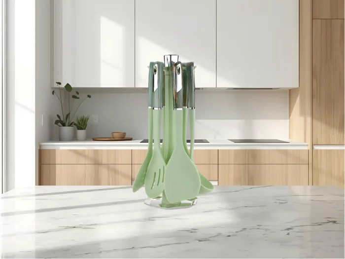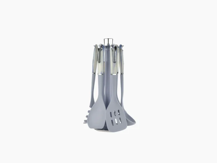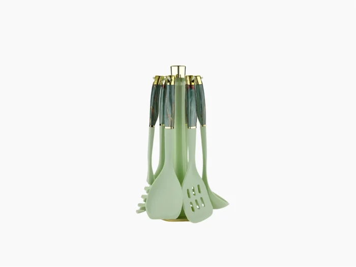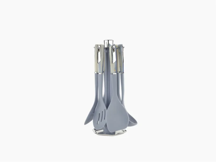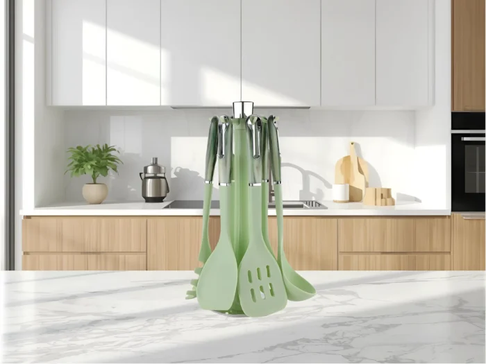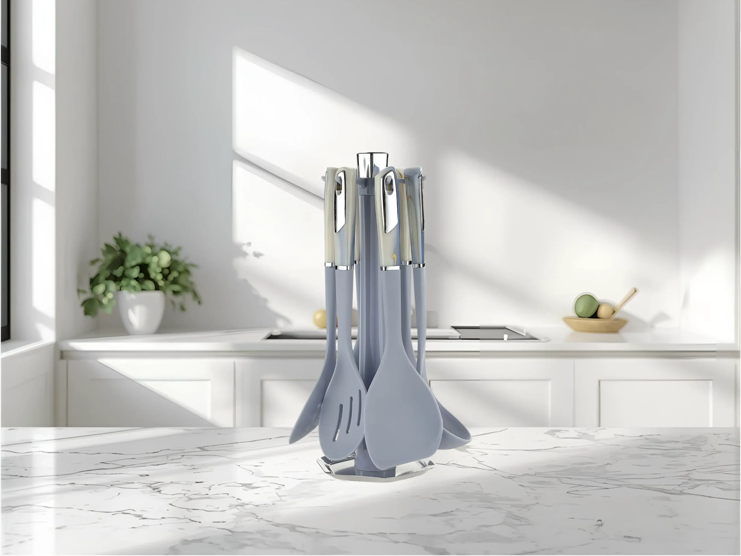 It comes with a practical rotating stand to keep your utensils organized and within easy reach. The non-stick silicone is safe for all cookware and easy to clean.
