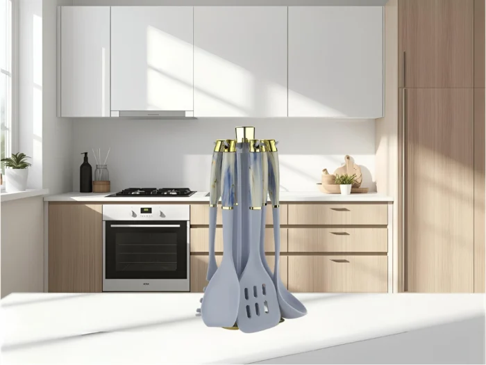 HomeyTown© New Marble 6-piece silicone utensil set with rotating stand – heat-resistant, stylish, and safe for all cookware.