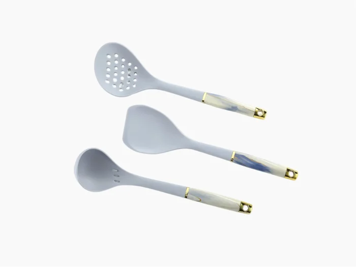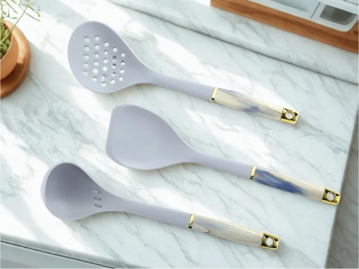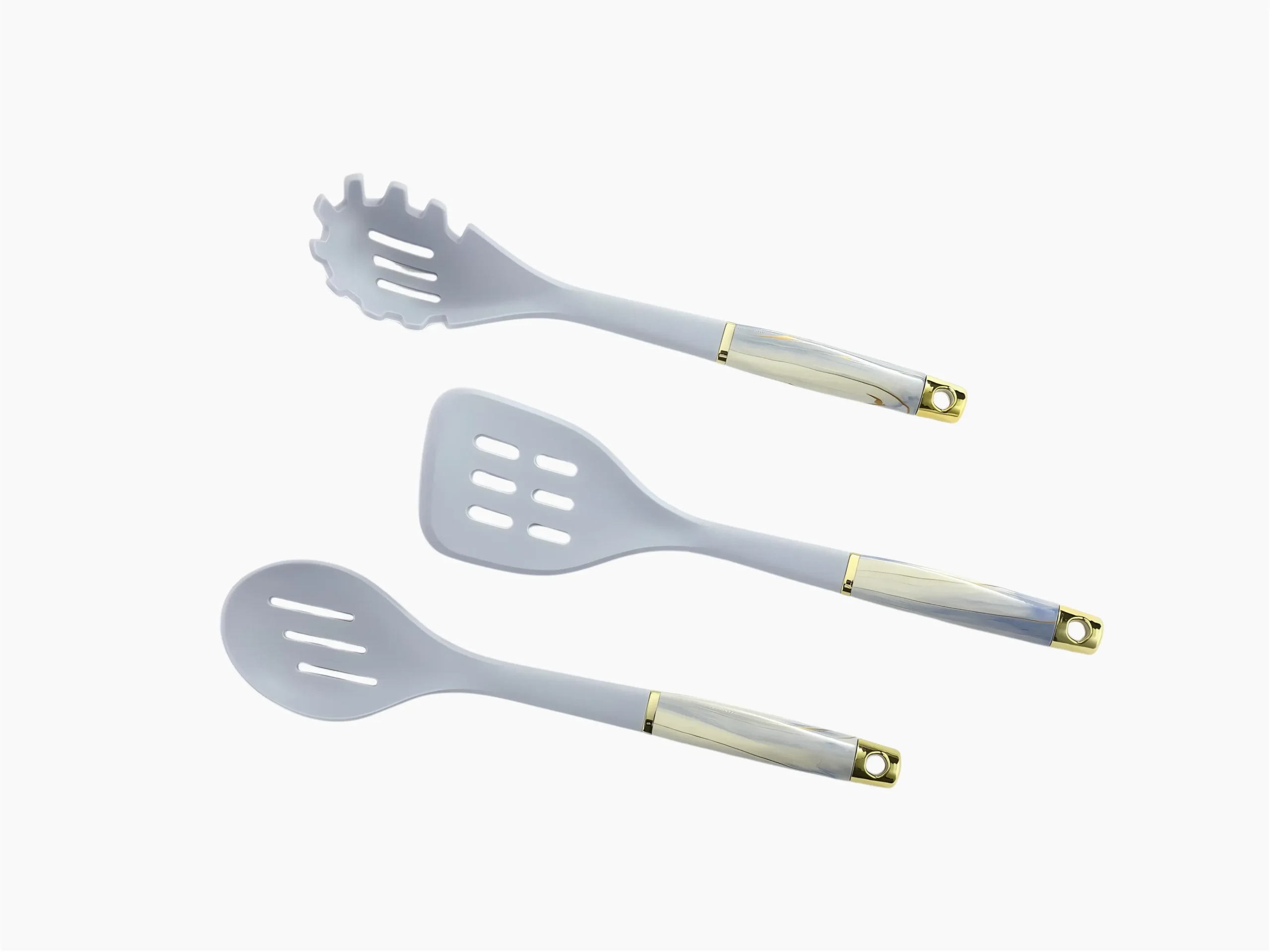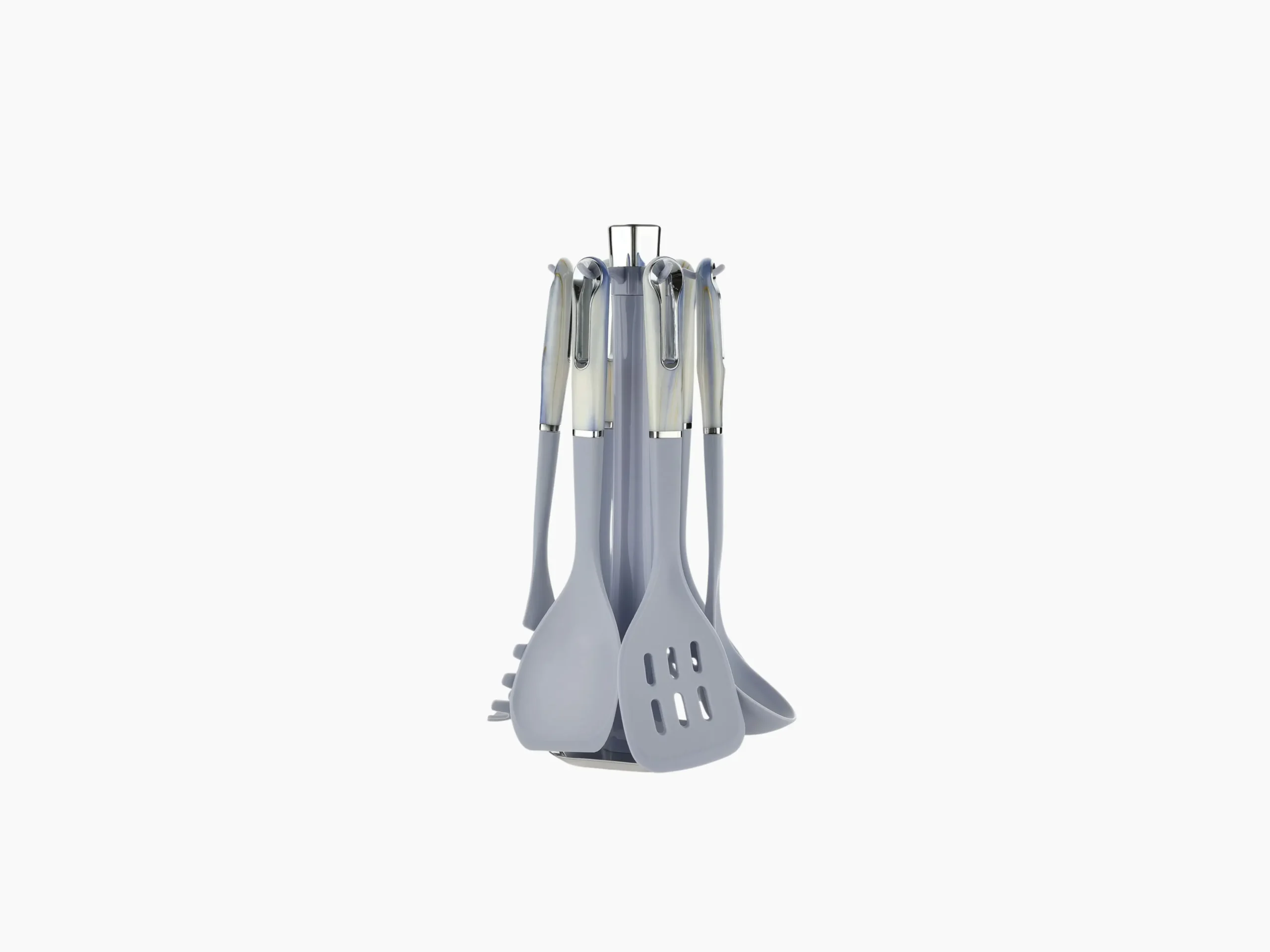 This set includes 6 essential cooking tools: spaghetti server, ladle, slotted spoon, solid spoon, perforated spoon, and turner – all made with heat-resistant silicone and stylish New Marble design handles.