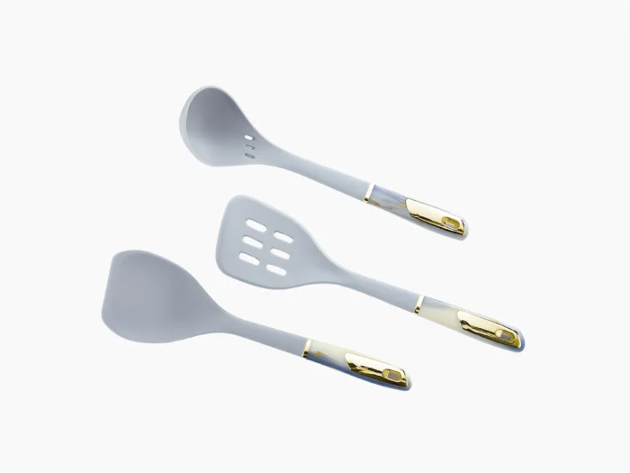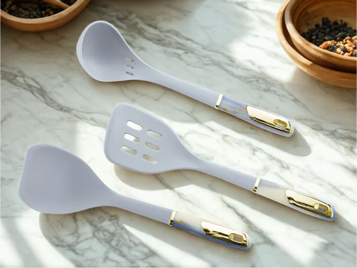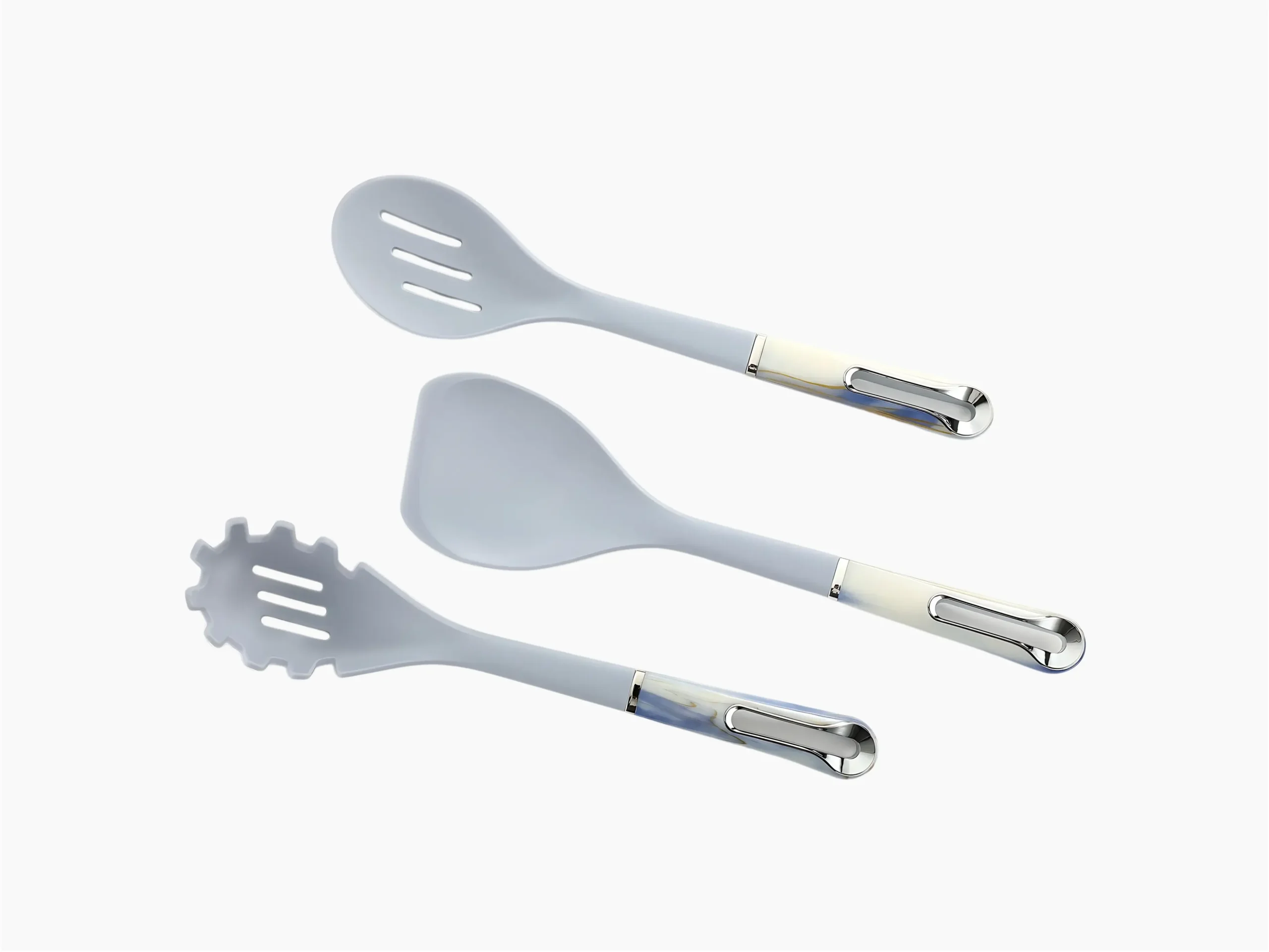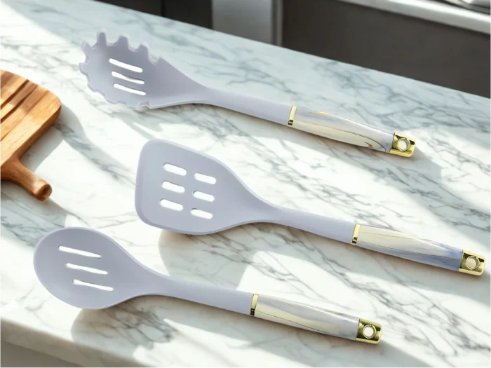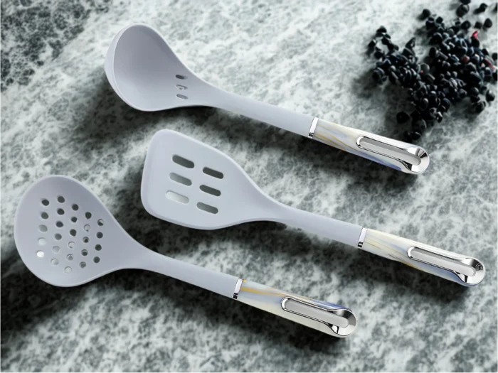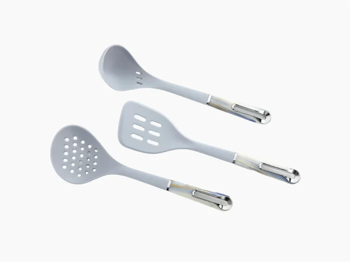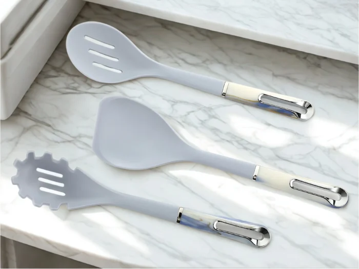 This set includes 6 essential cooking tools: spaghetti server, ladle, slotted spoon, solid spoon, perforated spoon, and turner – all made with heat-resistant silicone and stylish New Marble design handles.