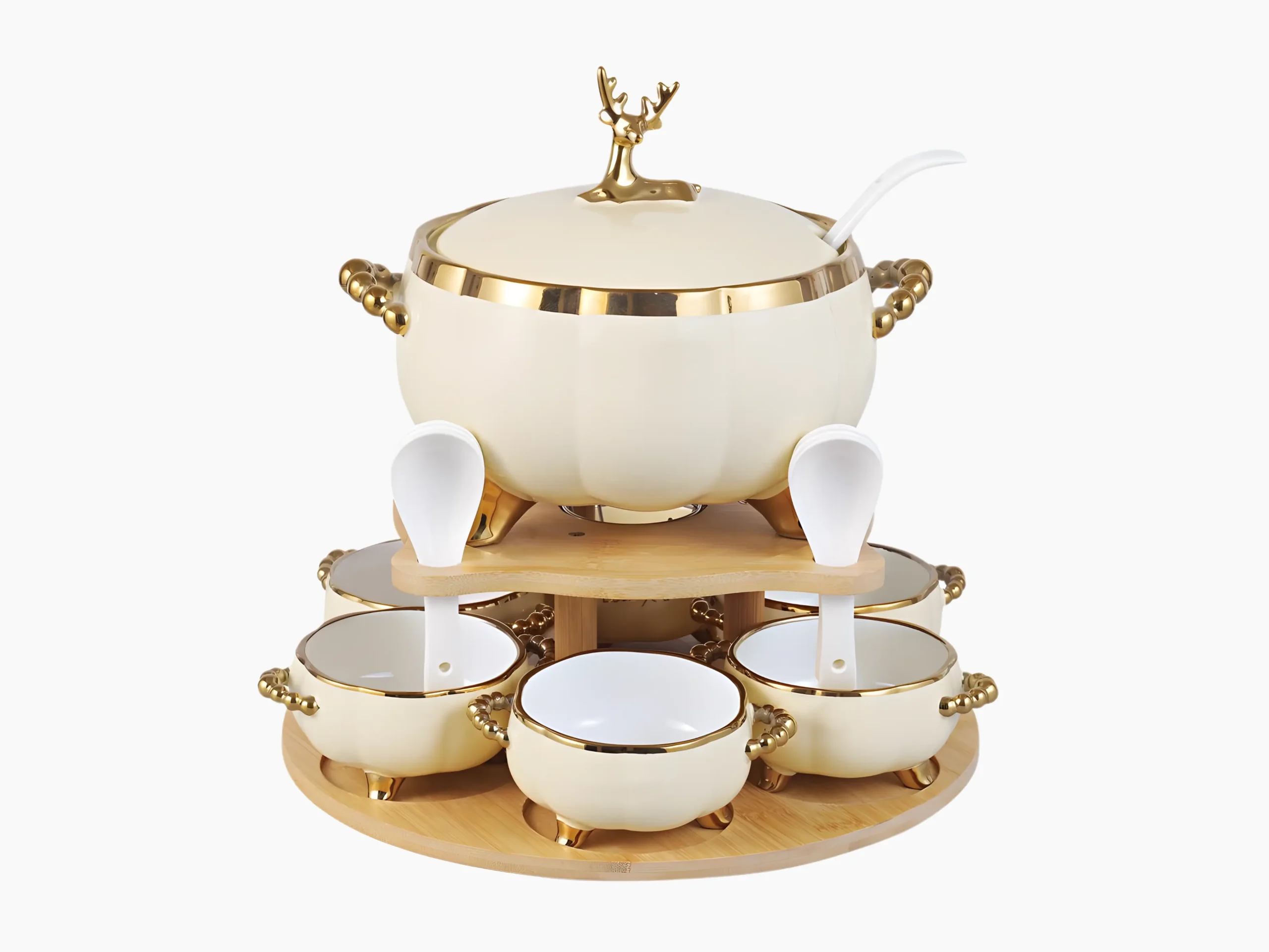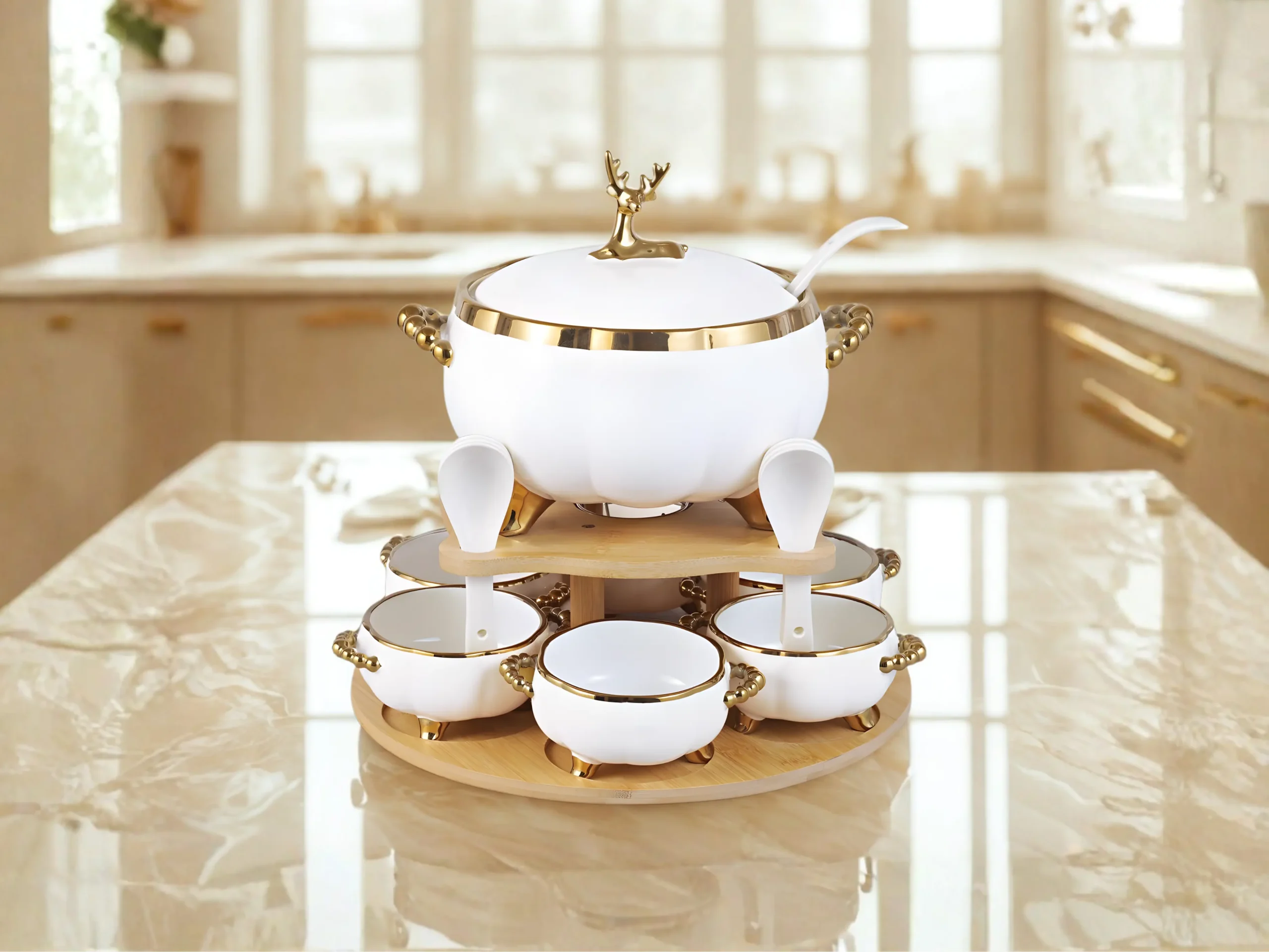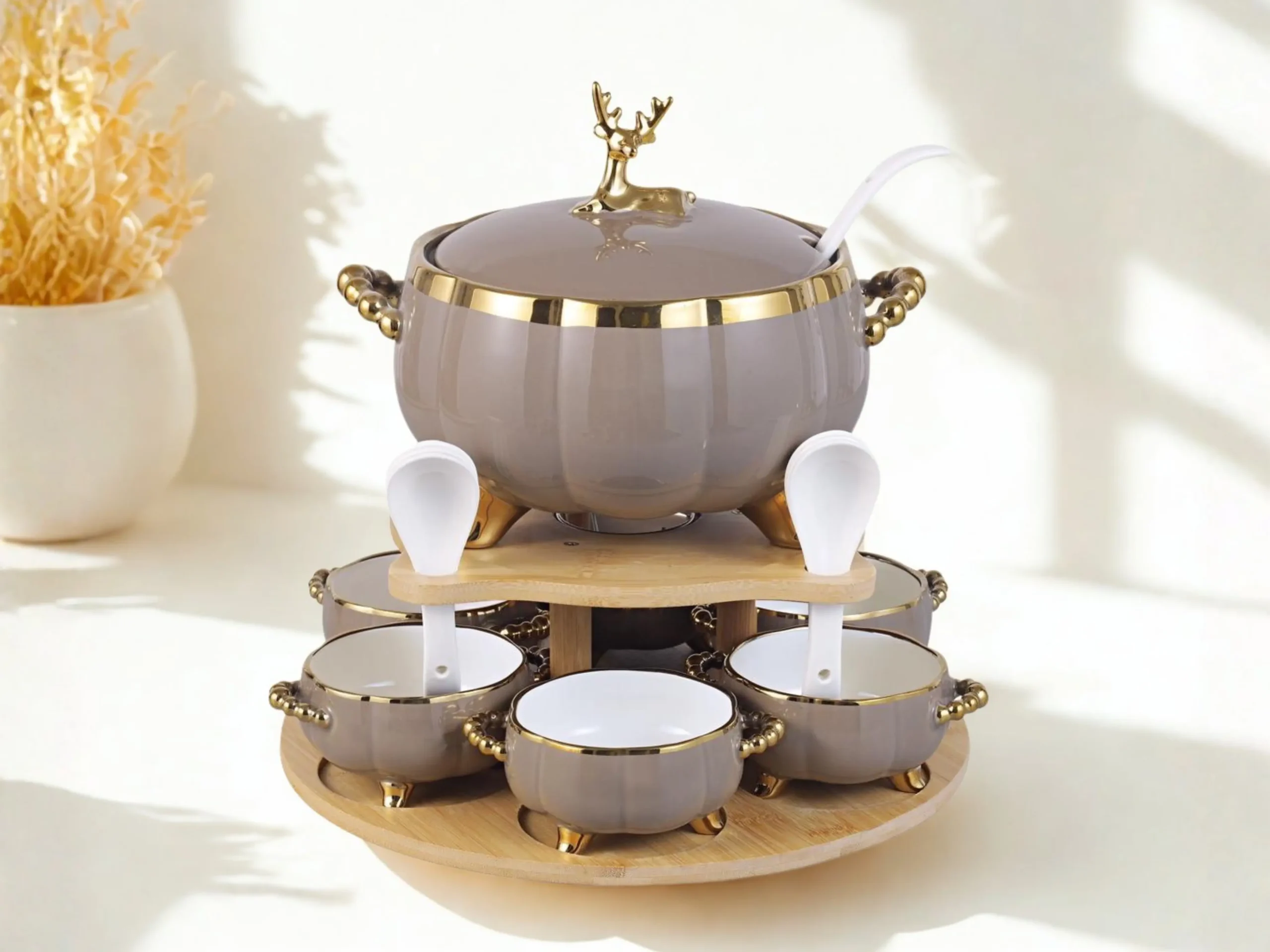 A luxurious soup set with an elegant design and a shiny gold inlay, presented in an elegant arrangement on a natural bamboo stand that combines good taste with modern luxury.