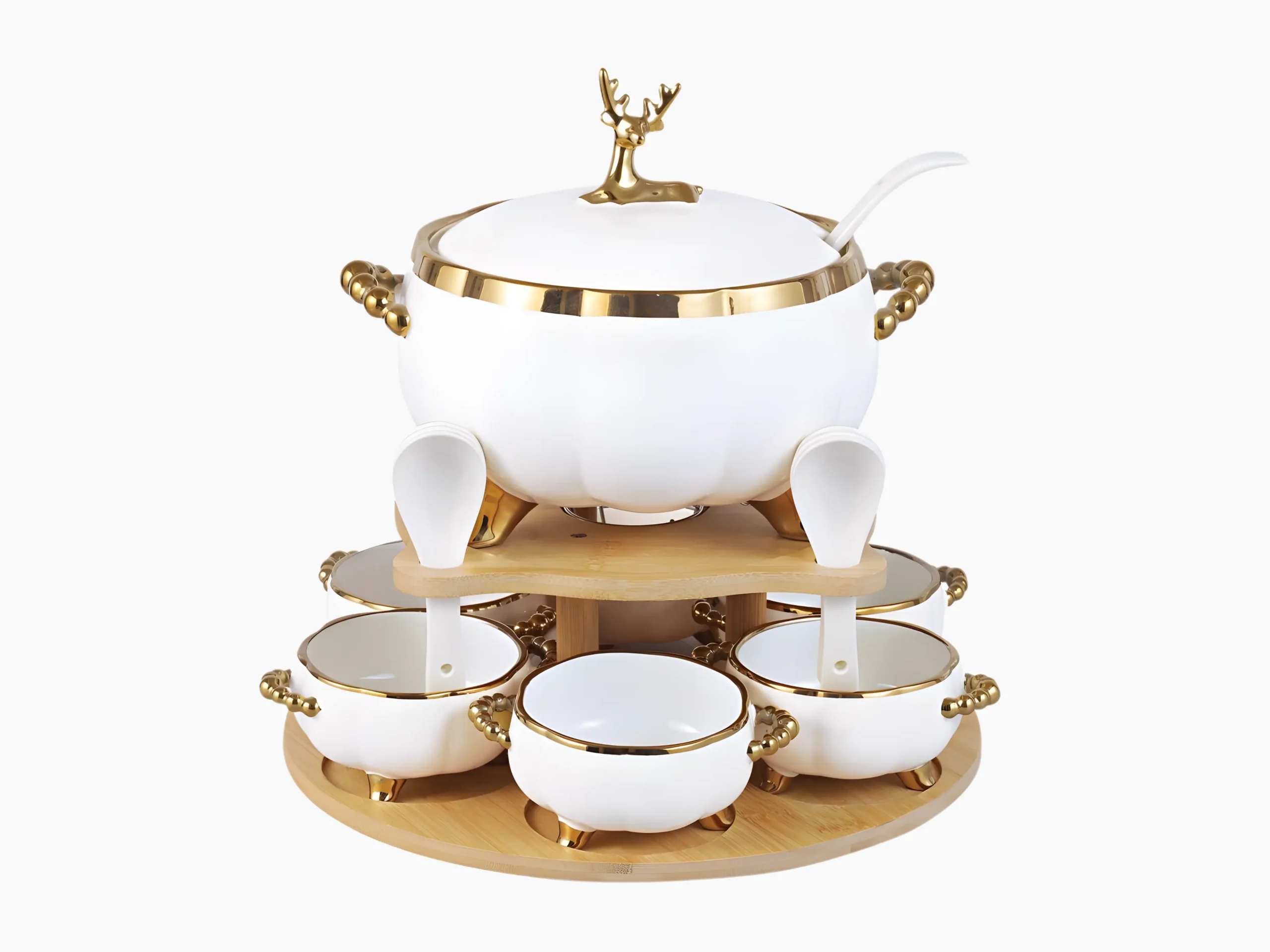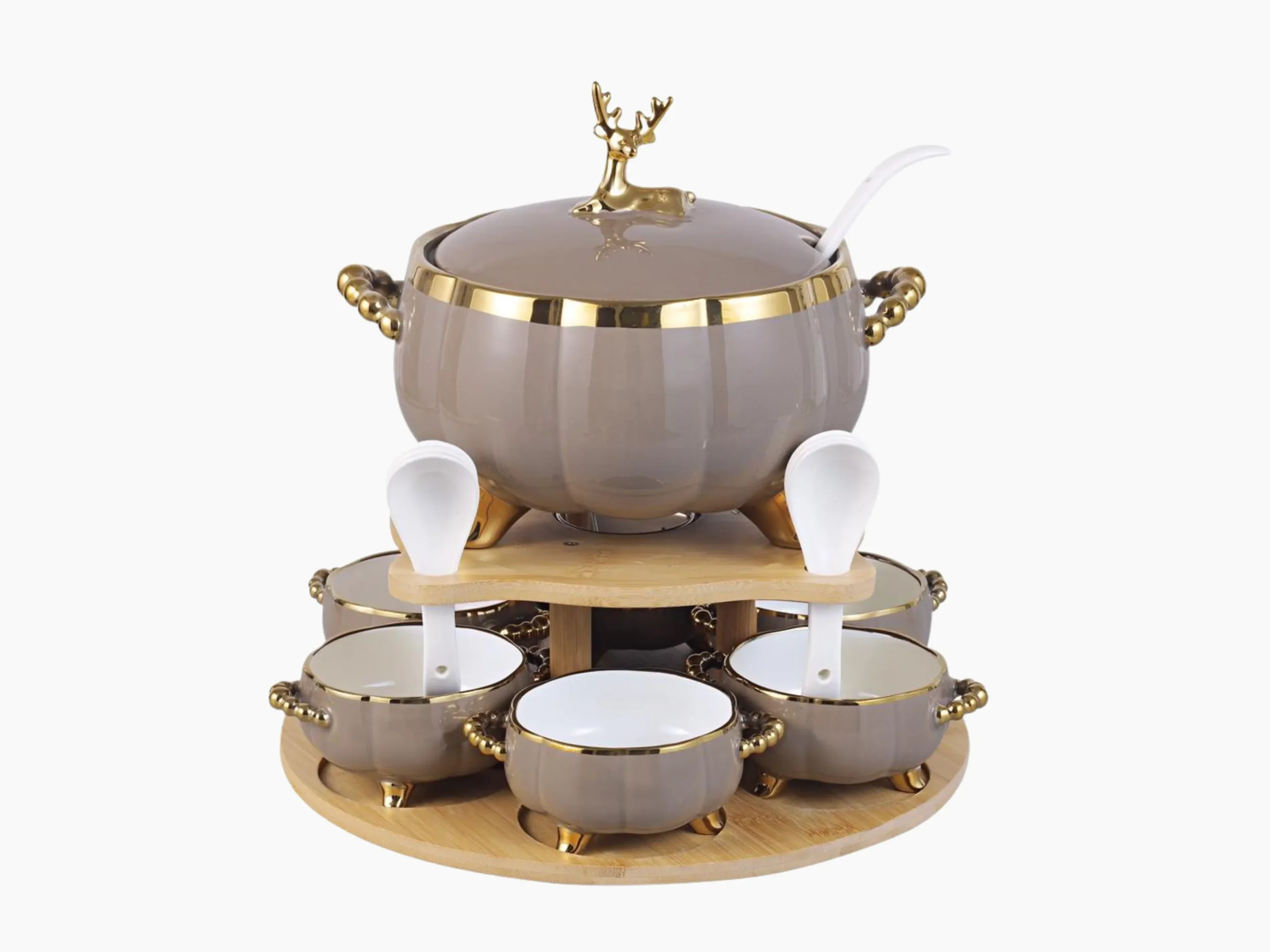 Take your serving experience to a new level with the elegant Homeytown © Soup Set. Featuring an elegant lid design in the shape of a golden gazelle, it adds a touch of luxury and sophistication to every occasion. Made from high-quality materials and glossy gold detailing, it comes with six mugs and six spoons arranged on a natural bamboo stand.
