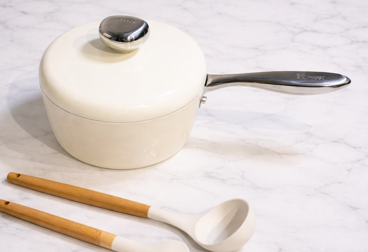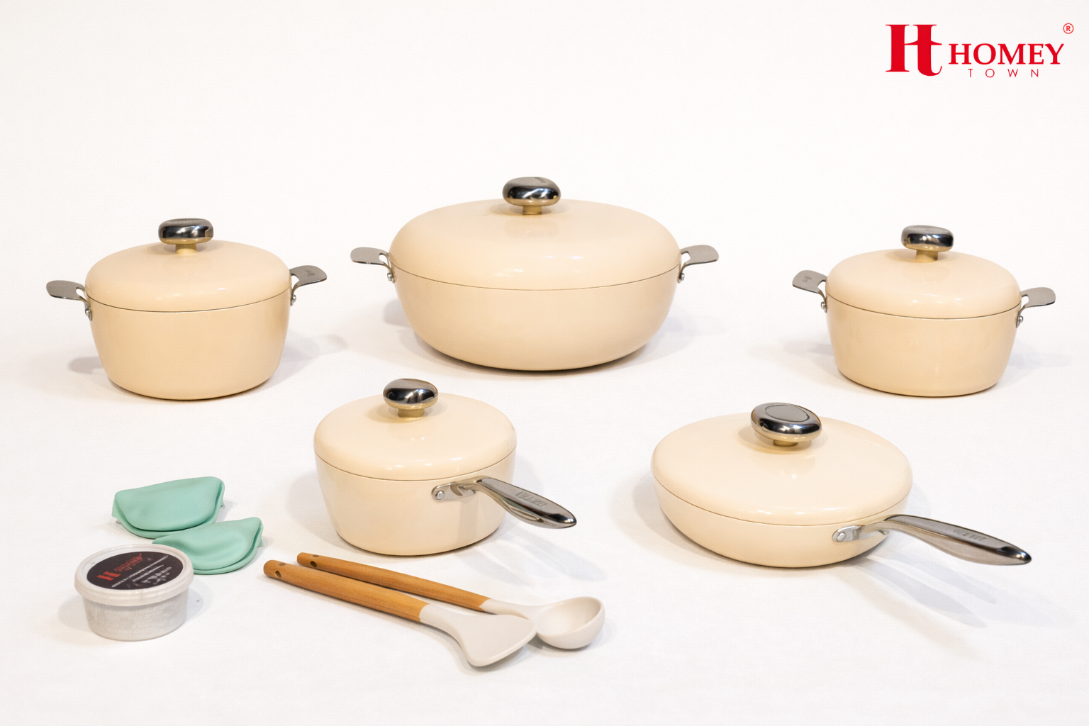 The Home Town © Cobble Cookware Set is made of Italian granite with an elegant, modern design. It includes 14 pieces in a range of sizes suitable for everyday cooking as well as family gatherings. It features excellent heat distribution and a practical surface that helps make cooking easier, along with a 12-month warranty and easy online warranty activation.